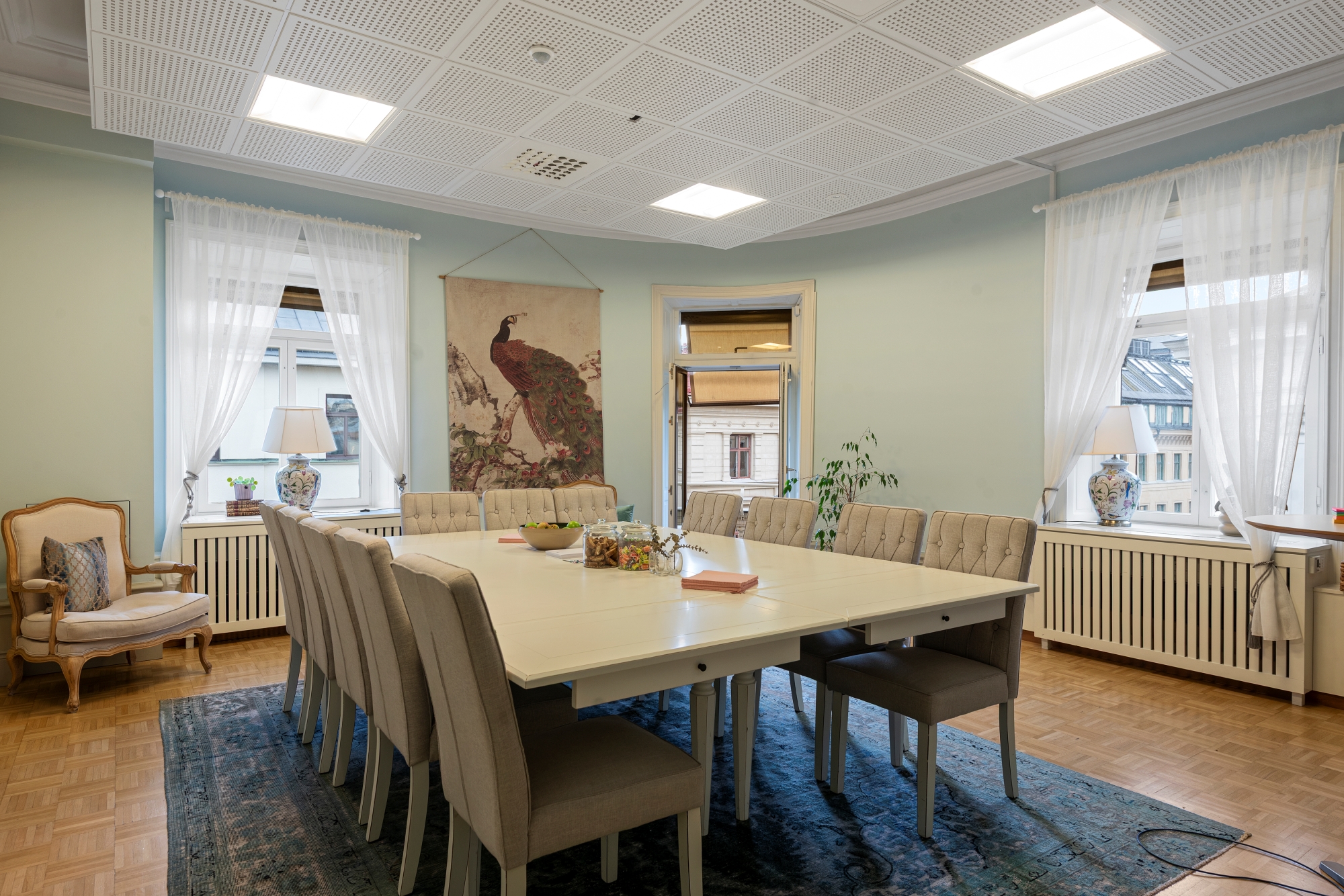 Mycket trevliga omgivningar. Lokalen ligger ett stenkast från Hötorget med torghandel, Konserthuset och Sergelgatan.